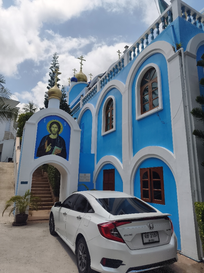 A white Honda Civic sedan, bearing Thai license plate ษข 2137 Phuket, is parked on a paved driveway in Baan Hua Thanon, Thailand, with its rear facing the viewer. The vehicle partially obscures the lower section of a large Orthodox church, which serves as the primary subject of the image. The church is painted a bright blue with white arched architectural details and features multiple golden onion domes, each surmounted by an Orthodox cross. A prominent archway on the left side of the building displays a large icon of Jesus Christ holding a book and gesturing a blessing. Behind this archway, a flight of concrete stairs ascends. The church facade exhibits multiple arched windows with dark brown wooden frames. Green foliage is visible around the church structure and a potted plant sits near the archway in the foreground. The scene is captured under a partly cloudy sky during daylight hours. No individuals are present in the image.