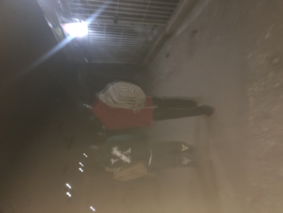 Two figures stand in a dimly lit, enclosed space. The area appears to be a narrow passage or tunnel, with a grated ceiling allowing some light penetration. The person closest has a light-colored backpack and wears a red top and black pants. The other wears a darker top with a white pattern on the back, and carries a light colored bag. The setting looks stark, with weathered walls.