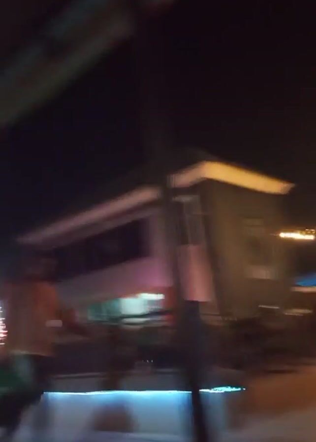 n outdoor patio at night. It's lit with string lights and neon lights. Several people are visible, some walking around, others sitting at tables inside a building. There's music playing in the background. A person in the foreground walks by carrying a green bag. A table with various objects is visible in the bottom right corner. The camera is moving slightly, giving a shaky perspective.