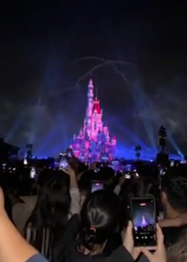 A nighttime view depicts a colorful, brightly lit castle at the center of the scene. Below it, a crowd of people are holding up their phones, presumably recording or taking pictures of the castle and its accompanying light show. The sky is dark and partially illuminated by the castle's lights and what appears to be a faint, arcing display above it.