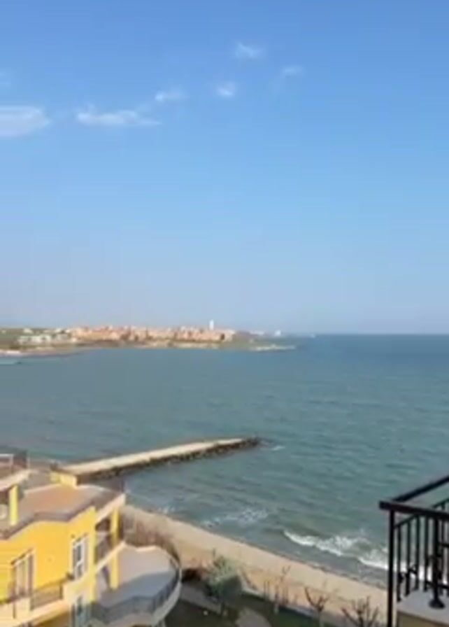 The video presents a daytime view from a high vantage point, possibly a balcony, overlooking a coastal scene