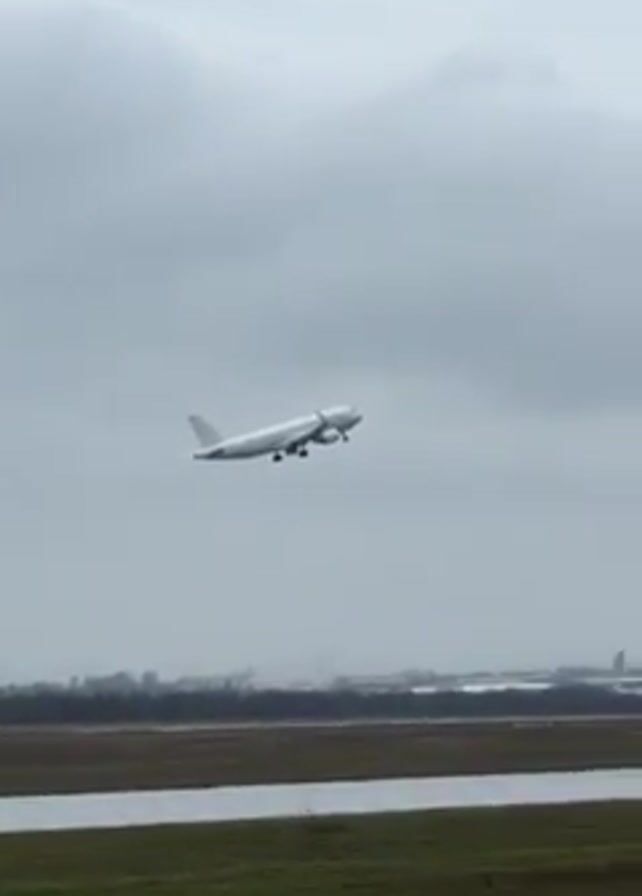 n airplane ascending into the sky against a cloudy gray sky. The plane is white and has its landing gear down. The foreground consists of wet pavement, and a grassy field runs alongside a runway in the midground. Beyond that is a line of trees. In the far distance, some nondescript buildings are visible.