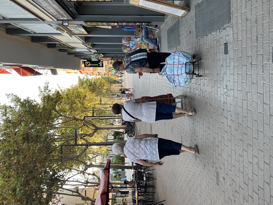 This image displays the Rambla Principal in Vilanova I La Geltrú, Spain, observed during late afternoon or early evening. The street is a pedestrian-friendly, brick-paved thoroughfare lined with mature trees, multi-story buildings, and commercial establishments. In the foreground, three elderly women are walking away from the camera. The woman on the left wears a light-colored patterned short-sleeved top, dark capri pants, and light flat sandals. The central woman wears a white short-sleeved top, blue capri pants, and light wedge sandals, pushing a two-wheeled shopping cart with a red-patterned bag. The woman on the right, wearing a dark patterned short-sleeved top, dark pants, and dark shoes, carries a dark patterned backpack. She pushes a black two-wheeled cart carrying a large, light blue floral-patterned bag secured with red straps. This woman is observed looking to her right and gesturing with her right hand. To the left, an outdoor seating area of a café is visible, featuring black tables and chairs under a reddish awning. Further down the Rambla, additional pedestrians, including adults and children, are present. Bicycles are parked along the left side. The right side of the street is bordered by multi-story buildings housing businesses, identified by signs such as "La Terraza de Manolo - BAR RESTAURANT" and a partial "SUPER MARKET" sign with a green leaf logo. Merchandise is displayed outside these shops. A person in blue jeans and a light shirt is seated on a white chair outside a shop on the right. Golden light filters through the tree canopy, illuminating the street.