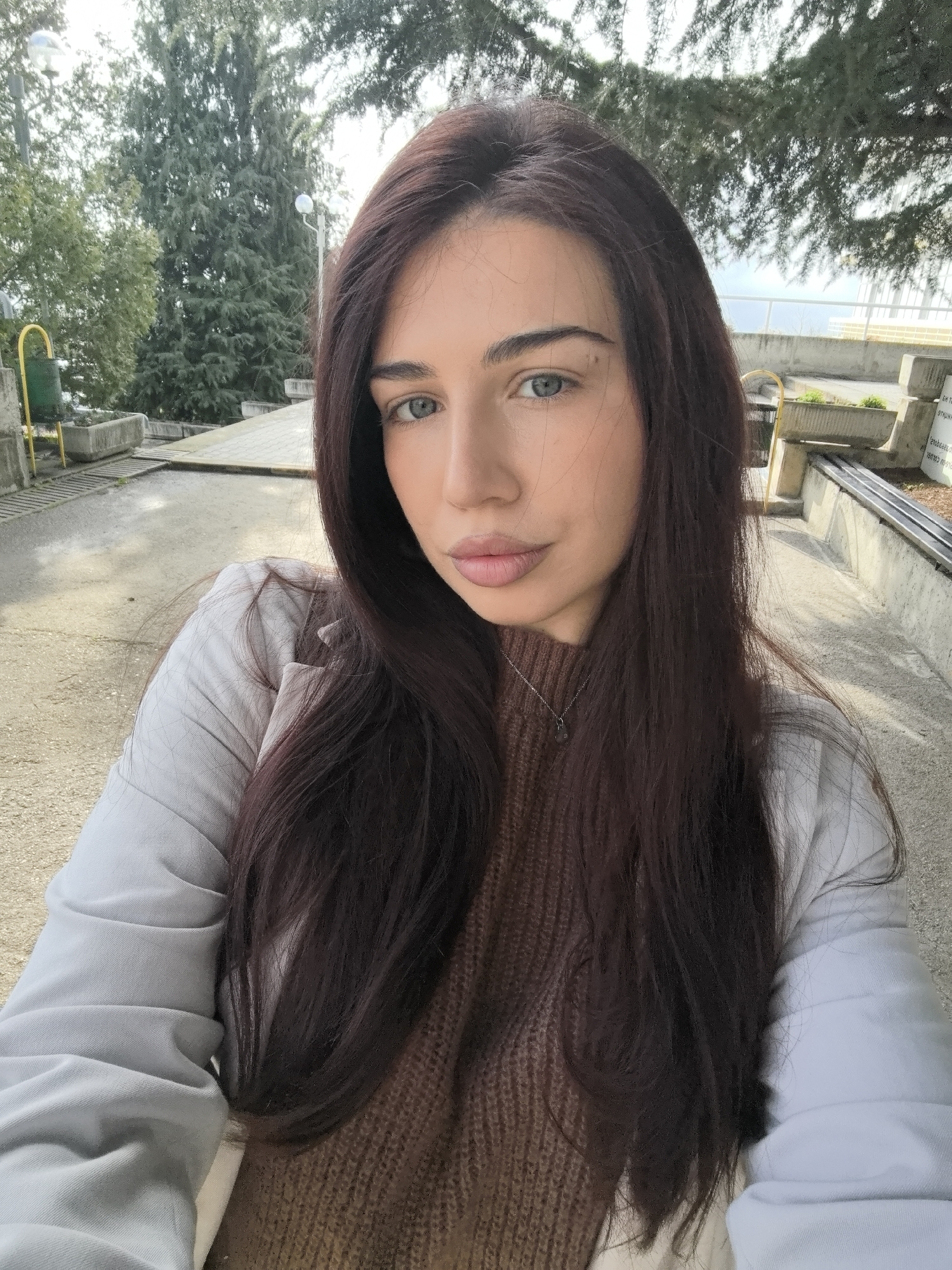 The photograph depicts a woman with long, dark brown hair, blue eyes, and fair skin. She is wearing a brown sweater and a light grey jacket. A silver necklace is visible around her neck. The background suggests an outdoor urban environment, likely a park or public space, indicated by the presence of trees, concrete walkways, benches, and yellow metal fixtures. The lighting suggests it is daytime, possibly overcast. The image appears to be a selfie. The location is Bogomilovo, Bulgaria.