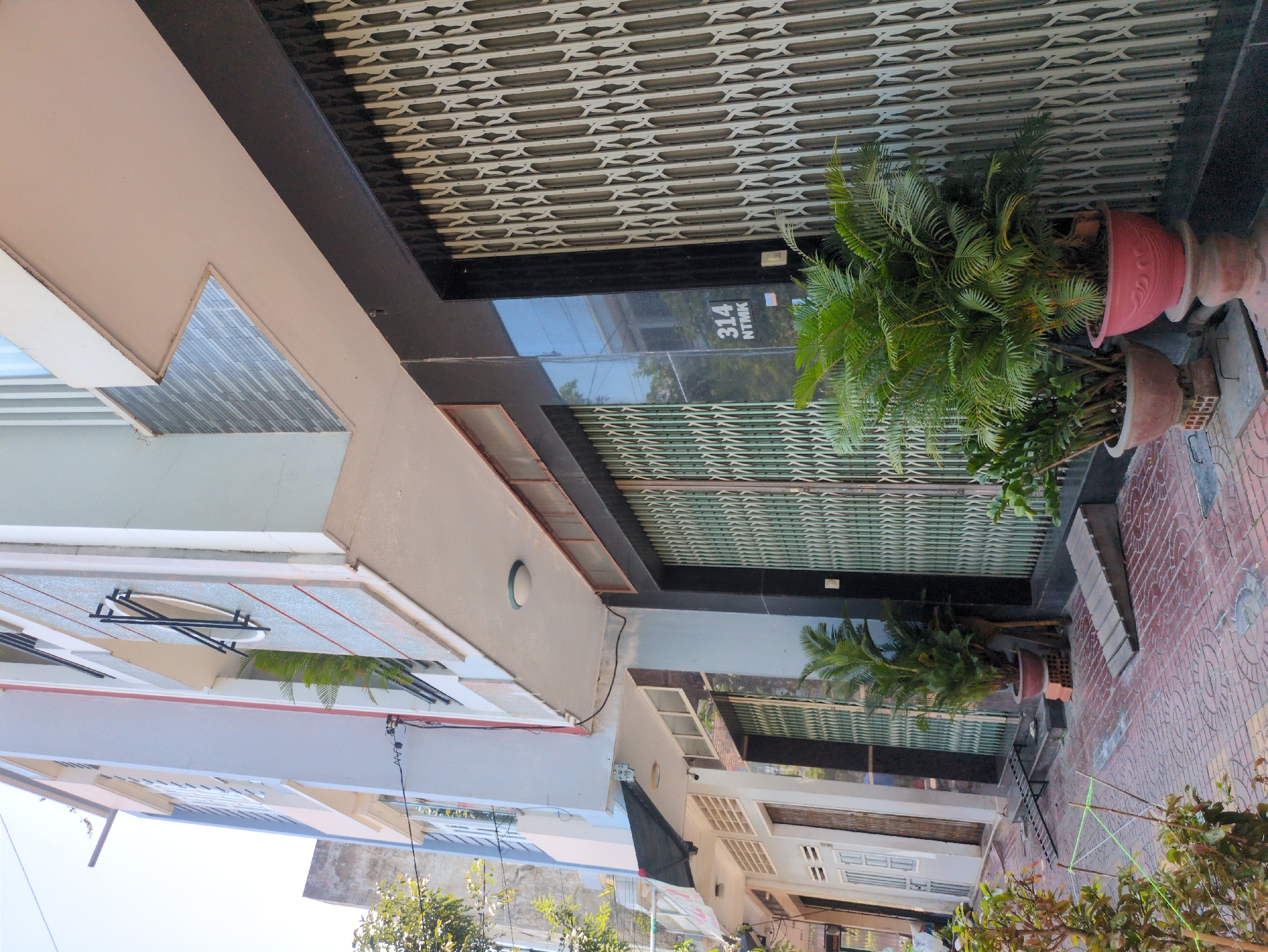 The image depicts a street scene in South Quy Nhon Ward, Vietnam. The focus is on a building facade with a metal rolling shutter. The building's address, "314 NTNK," is visible. Potted plants sit on the sidewalk in front of the building. The sidewalk is paved with reddish-brown tiles. Other buildings and greenery can be seen in the background.