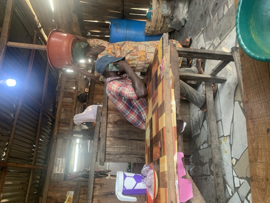The scene depicts an interior view of a commercial establishment in Zango-ndaji, Nigeria, possibly a local shop or eatery, constructed with raw wooden plank walls and a corrugated metal roof