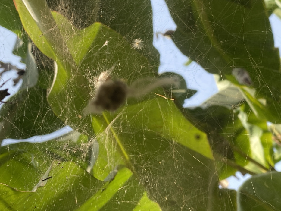 The scene, located in Ufueseni, Nigeria, depicts a close-up view of a complex, three-dimensional spiderweb in the foreground. The web is densely woven with fine, translucent strands, appearing light greyish-white due to dust and debris adhering to it, and is stretched across a natural environment. Centrally positioned within the web is an irregular, ovoid object, approximately 2-3 cm in length, appearing as a compacted mass of light brown and grey fibrous material, possibly an insect wrapped in silk or an egg sac. A wispy, elongated tail-like projection extends downwards from this object. To the right of the central object, embedded in the web, is a small, distinct star-shaped white particulate. Further to the lower-left, a thin, dried, light brown twig or stem fragment is caught within the webbing. Various other minute specks of white and dark debris are scattered throughout the intricate web structure. The background consists primarily of blurred, vibrant green foliage from a plant or tree, indicating an outdoor setting. Several large, glossy green leaves are visible, with varying degrees of focus. Gaps in the foliage reveal portions of a clear, light blue sky, particularly prominent on the right side and upper left quadrant of the image. The lighting is consistent with bright, natural daylight. No individuals or active interactions are observed.
