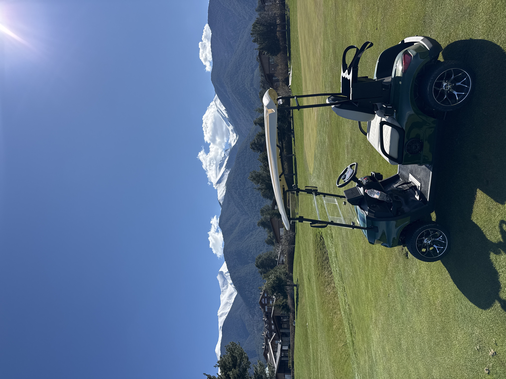 A golf course scene in the city of Unknown, Bulgaria, features two green golf carts parked on vibrant green grass. A white boat-shaped object is securely mounted on one of the golf carts. The backdrop reveals snow-capped mountains under a clear, bright blue sky. In the lower portion of the frame, houses are visible at the base of the mountains. The sun shines brightly from the upper left of the frame.