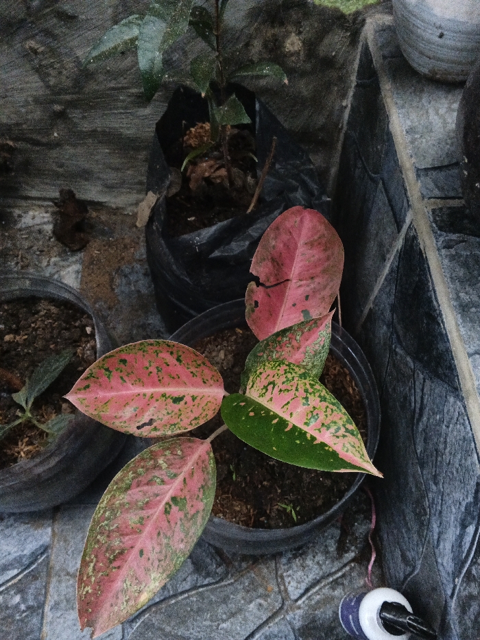 The image displays a localized outdoor scene featuring potted plants on a tiled surface. In the foreground, a prominent ornamental plant, consistent with an Aglaonema species, is contained within a black plastic pot filled with dark brown soil. Its leaves are variegated with distinct patterns of pink, green, and red; one large leaf exhibits a tear. To the left, a partial view of another black plastic pot containing soil and a small green plant is visible. Behind the central plant, a smaller green-leafed plant is rooted in a black plastic bag filled with soil. The ground surface consists of grey, rectangular tiles laid in a staggered pattern. A textured, grey wall, possibly concrete or stone, forms the background. To the lower right, a white and purple electrical plug or adapter with a black tip is present, connected to a thin, reddish-pink wire on the tiled ground. No individuals are depicted. The scene is located in São Félix do Xingu, Brazil.