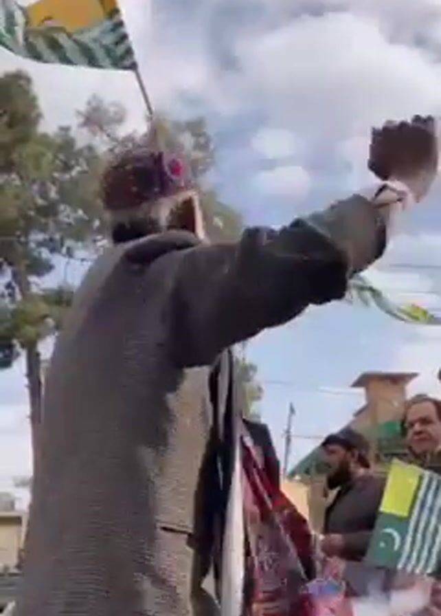 group of men outside holding and waving flags. The flags are green and white with a yellow stripe. One man at the front has a fist raised. He wears a dark coat and a white cap. Behind him are other men holding the same flag and a sign in what appears to be Urdu. The event takes place during the day with a partly cloudy sky in the background. Trees and buildings are visible.