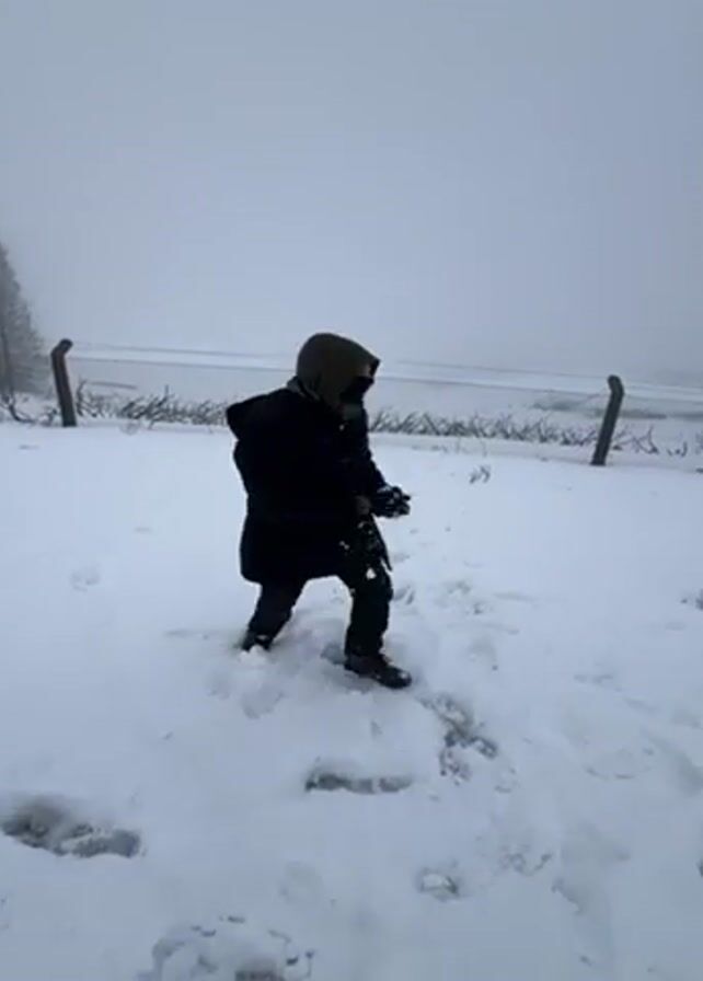 person in a dark coat and hat bending over and picking up snow, forming a snowball. They throw the snowball in the direction of two other people who are further away in the snowy landscape. The background includes a wire fence and some sparse trees, all under a gray, foggy sky, indicating a snowy, overcast weather condition. The ground is entirely covered in fresh snow, with visible footprints.
