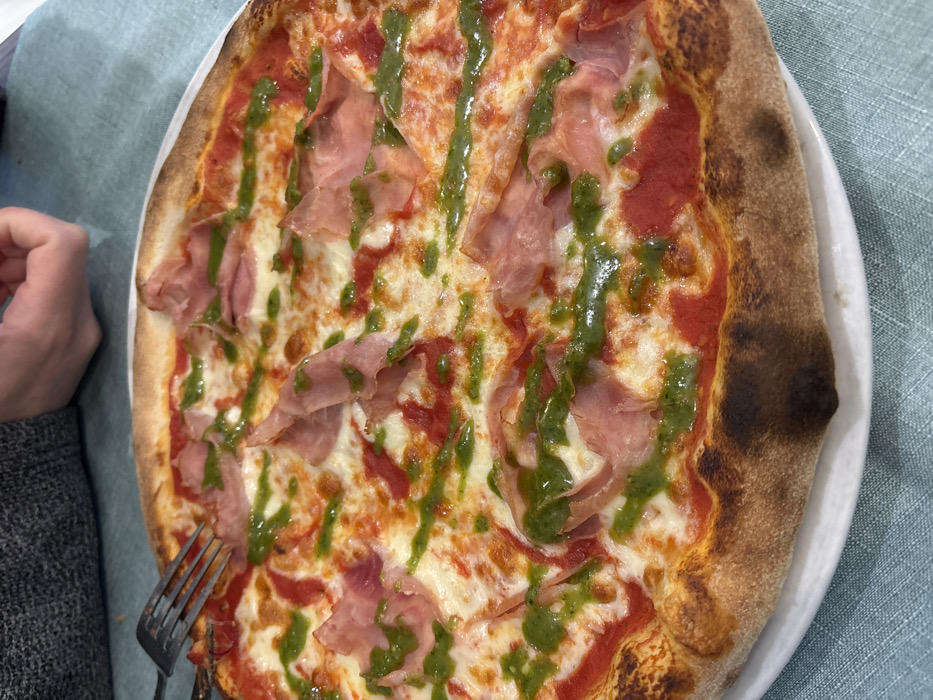 This close-up image depicts a partially consumed pizza on a white round plate, situated on a light blue textured tablecloth, within a dining establishment in Ferrara, Italy. The pizza features a well-baked, golden-brown crust with some charred spots, a red tomato sauce base, melted white cheese, and is generously topped with numerous slices of light pink cured ham (prosciutto) and a vibrant green pesto sauce drizzled in parallel lines across its surface. A silver four-tined fork is visible in the upper-left quadrant, partially embedded in a pizza slice. Above the pizza, the hands of an individual, with a gray knitted garment visible on the left arm, are positioned, indicating the ongoing act of eating.