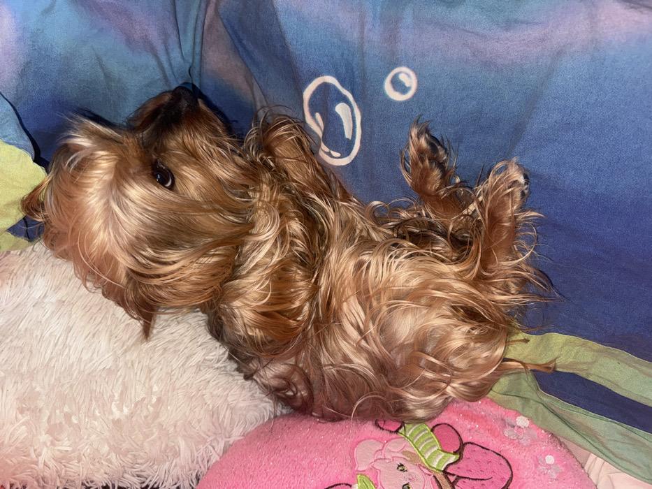 - "A small Yorkshire Terrier dog is depicted lying on its left side, slightly curled, on a bed or resting surface" by FM-uodRx2, licensed under CC BY 4.0