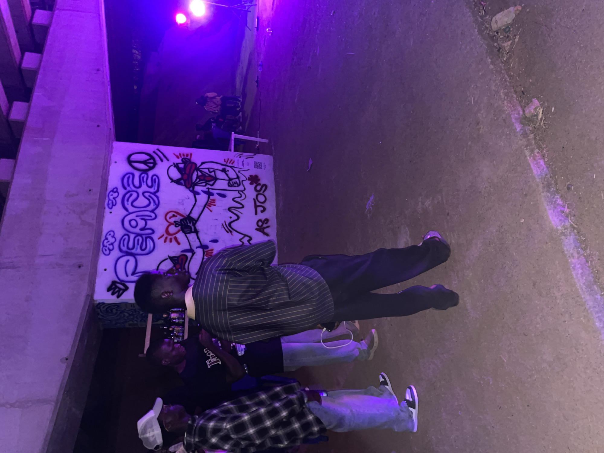 The image depicts an outdoor scene in what appears to be a public space or underpass, possibly in Jos, Nigeria. The lighting is predominantly artificial and purple, casting a somewhat dim ambiance over the area. Three individuals are visible. One is wearing a striped jacket and dark pants. Another individual is wearing a black shirt with an emblem on it, denim jeans and the third person in the foreground is wearing a white cap, a checkered flannel shirt, and light-wash denim jeans with black and white sneakers. A graffiti-covered wall is visible in the background, next to a makeshift bar set up. There are bottles displayed on the shelf, suggesting a beverage service. The ground is a paved surface, and there's an adjacent concrete wall. The overall impression is that this is an informal gathering of people in a public or semi-public urban space.