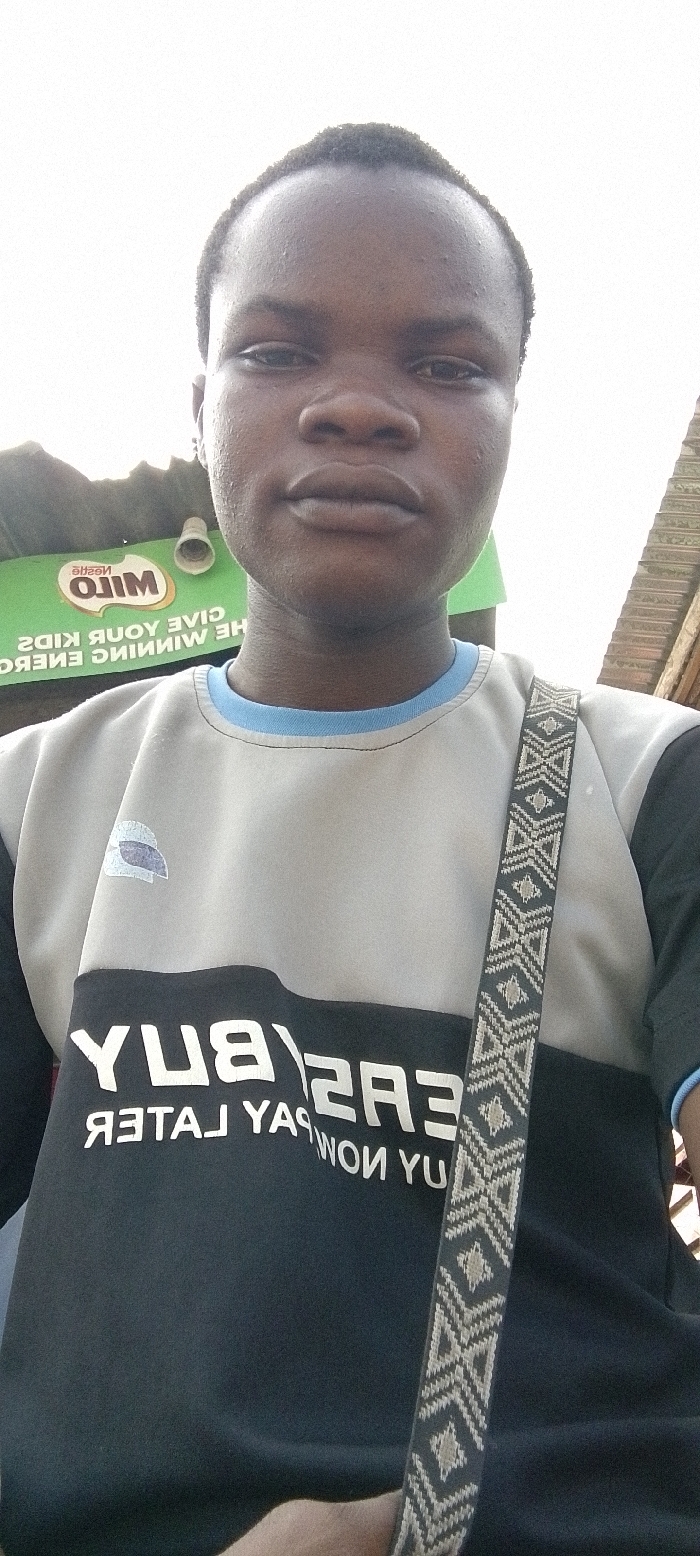 A single individual, a young person with dark skin and short dark hair, faces the camera directly. The person wears a two-tone long-sleeve shirt; the upper section is light grey with a light blue collar, and the lower section is black. White, reversed text on the black section partially reads "EASY BUY" and "YAS LATER" (likely "PAY LATER"). A grey strap with a white geometric pattern is visible over the person's right shoulder and chest. In the background to the left, an inverted green sign displays "NESTLE MILO" and the partial slogan "GIVE YOUR KIDS THE WINNING ENERG" (energy). To the right, a section of a building with a corrugated metal roof is visible. The scene is outdoors with an overcast sky in Ajara, Nigeria.