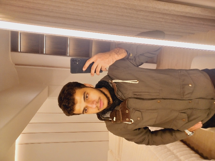 A young man takes a selfie in a mirror. He holds a smartphone in his right hand, his face clearly visible. He has short dark hair and a beard. He wears a dark green hooded jacket with brown detailing on the hood. The background suggests a bedroom, with a bright light fixture and blurred bedding. A closet or shelf system is also visible in the mirror's reflection. The overall image is casual and personal.