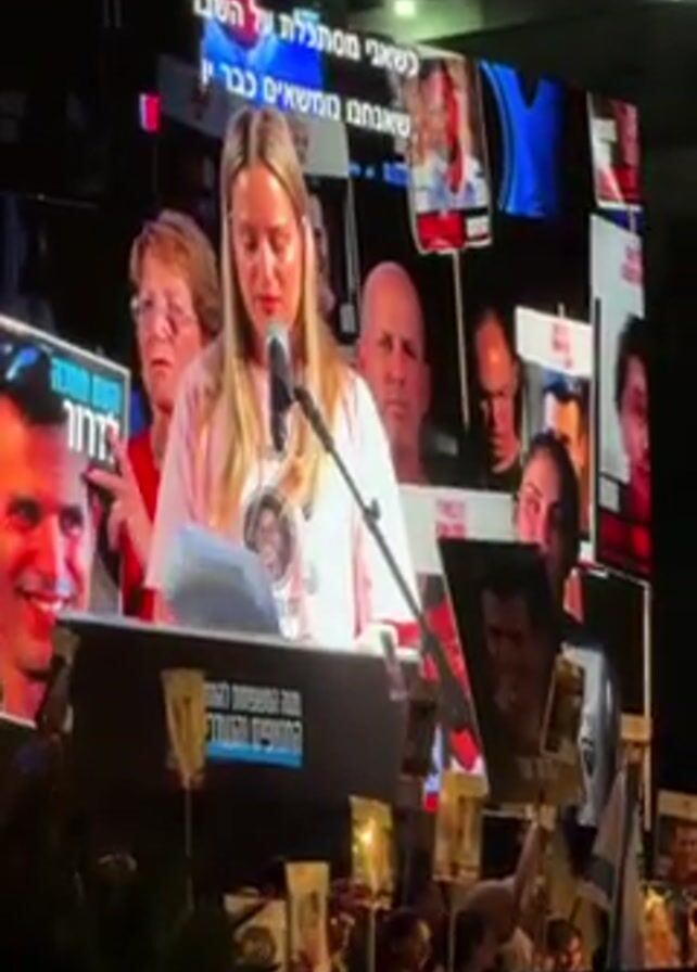 A woman is speaking at a lectern onstage in front of a crowd of people at night. The woman has blonde hair and is wearing a light pink shirt. A microphone is in front of her, and she is holding a piece of paper. Behind the woman, a large video screen displays images of people's faces. Some people in the audience are holding up signs with photographs on them. The Israeli flag is visible. The video pans back to show the crowd. More people are on the stage.