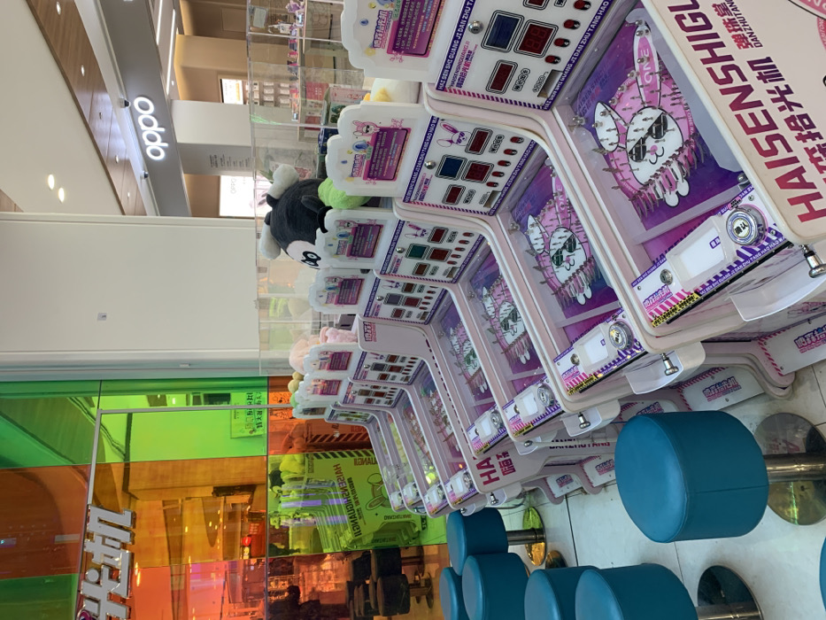 The image depicts an indoor commercial space, likely a shopping mall, located in Xihu District, China. The scene features a row of at least six identical white arcade-style game machines, positioned in the midground and extending towards the foreground. Each machine resembles a pinball or pachinko game, displaying a transparent top surface revealing a playing field with a pink and purple graphic of a cartoon rabbit character wearing sunglasses amidst various pins. The machines are labeled with "HAISENSHIGU" and Chinese characters. In front of the game machines, a series of teal-colored cylindrical stools with metallic bases are arranged, indicating a seating area. To the left, a large reflective partition with iridescent properties displays shifting hues of orange, red, and green, reflecting parts of the room. Behind the game machines, a display area holds various plush toys, including a large black Mickey Mouse-like character and several smaller, pastel-colored plush items. In the background, to the right, an "oppo" branded retail store is clearly visible with its white logo illuminated against a dark background, showcasing illuminated shelves with products inside. The overall environment is brightly lit with white walls and ceiling. No people are visible in the scene.
