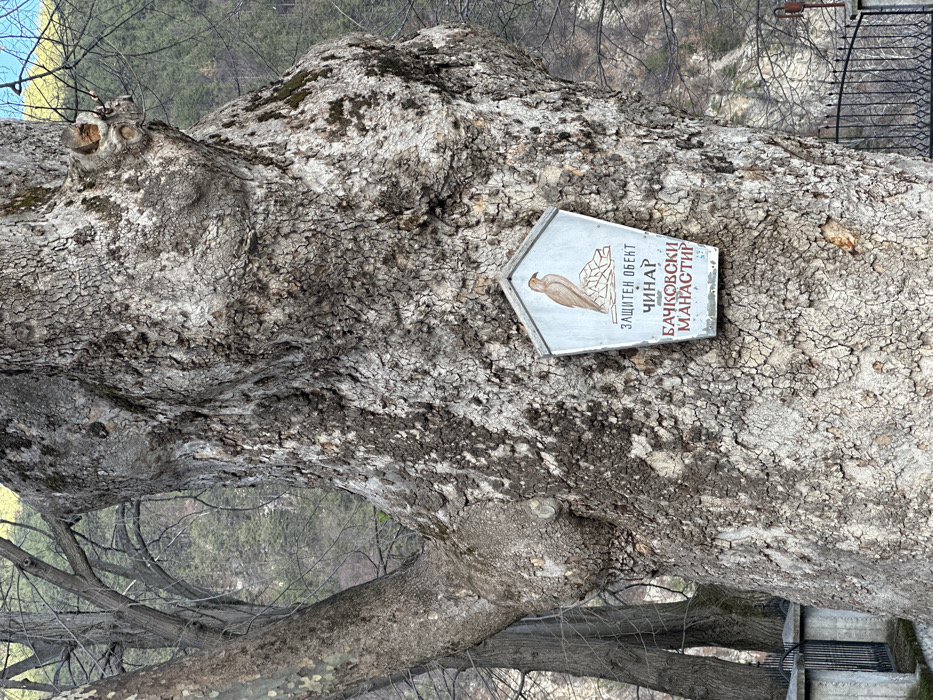 The image displays a detailed view of a large, mature tree trunk with rough, deeply textured, grayish-brown bark, indicating considerable age. Attached centrally to the trunk is a house-shaped sign, painted white with a light blue border. The sign features a brown illustration of a raptor, resembling a falcon, perched on a pile of rocks. Below the illustration, text in red Cyrillic characters reads "ЗАЩИТЕН ОБЕКТ" (Protected Object), "ЧИНАР" (Oriental Plane), and "БАЧКОВСКИ МАНАСТИР" (Bachkovo Monastery). To the left and right at the base of the main tree, sections of a black metal fence with concrete posts are visible. In the background, behind the main tree, numerous other trees with bare branches are present, suggesting a winter or early spring season. Beyond these trees, a vegetated hillside or mountain range rises. The scene is located in Bachkovo, Bulgaria, specifically in the area of the Bachkovo Monastery, as indicated by the sign. There are no people, actions, or interactions depicted in the scene.