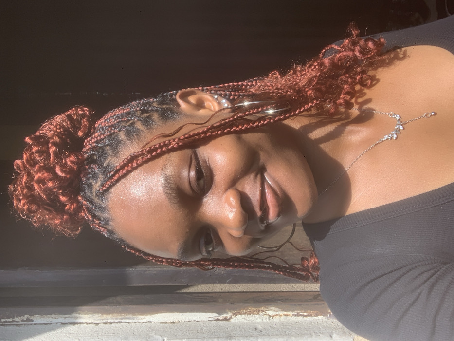 This image depicts a young adult female subject positioned in what appears to be a doorway or sunlit opening in Anantigha, Nigeria. Her complexion is dark, and her hair is styled in reddish-brown box braids, gathered into a high bun with several braids loosely framing her face and shoulders. She is smiling, with visible teeth, and directly facing the camera. She wears a large silver hoop earring on her left ear and multiple smaller earrings, including a reflective dangling piece, on her right ear. A silver-colored necklace with a floral-leaf motif and a central dangling element is visible around her neck. Her attire consists of a black ribbed top. The background on the left side of the frame features a brightly illuminated, textured light-colored vertical surface, consistent with a wall or door frame. The background to the subject's right is predominantly dark and shadowed.
