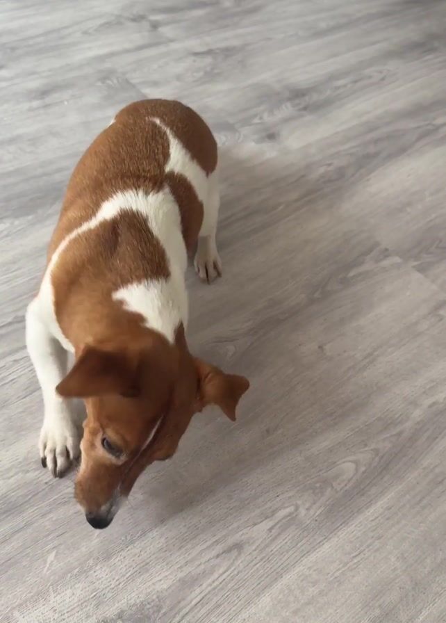 A tan and white Jack Russell Terrier is seen sitting in the middle of a gray wood-look floor. The dog is facing the camera, and an audible voice can be heard speaking. The dog wags its tail and twists from a seated position to a lying-down position. The dog then stands again, and the camera moves around to observe the dog from different angles. The dog then walks away.
