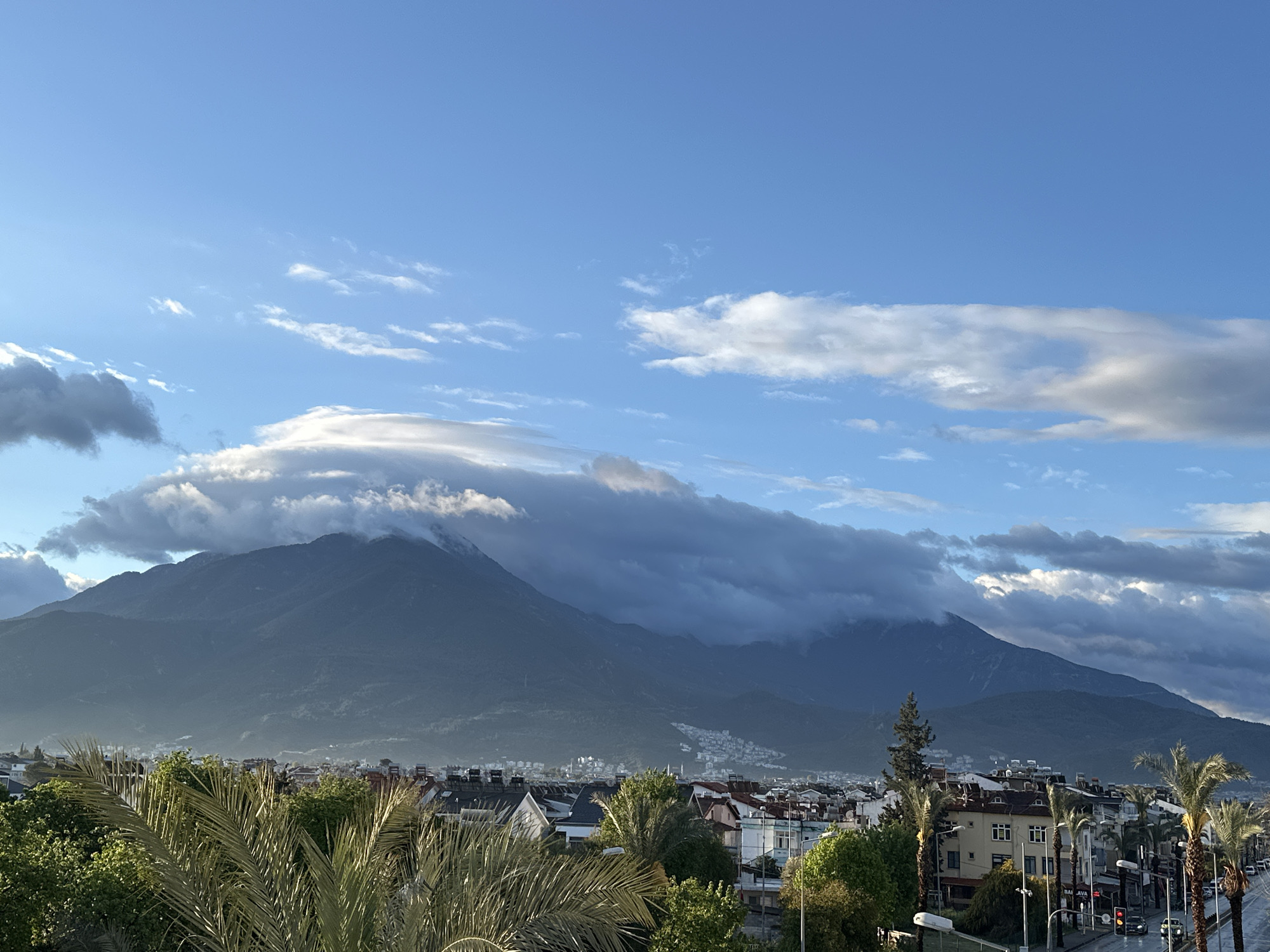 The image captures a scenic view of Fethiye, Turkey, with a prominent mountain range partially obscured by clouds in the background. The city lies in the foreground, featuring a mix of residential and commercial buildings, including a few with white facades. Palm trees and other greenery are interspersed throughout the cityscape and along the street. The sky above is partly cloudy, with patches of blue visible. The scene appears to be captured during daylight hours.