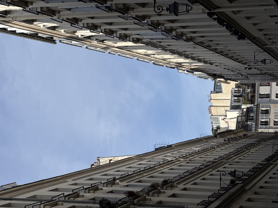 - "This image depicts an upward view of a narrow urban thoroughfare in Paris, France, characterized by its distinctive Haussmannian architecture" by FM-QhCsg2, licensed under CC BY 4.0