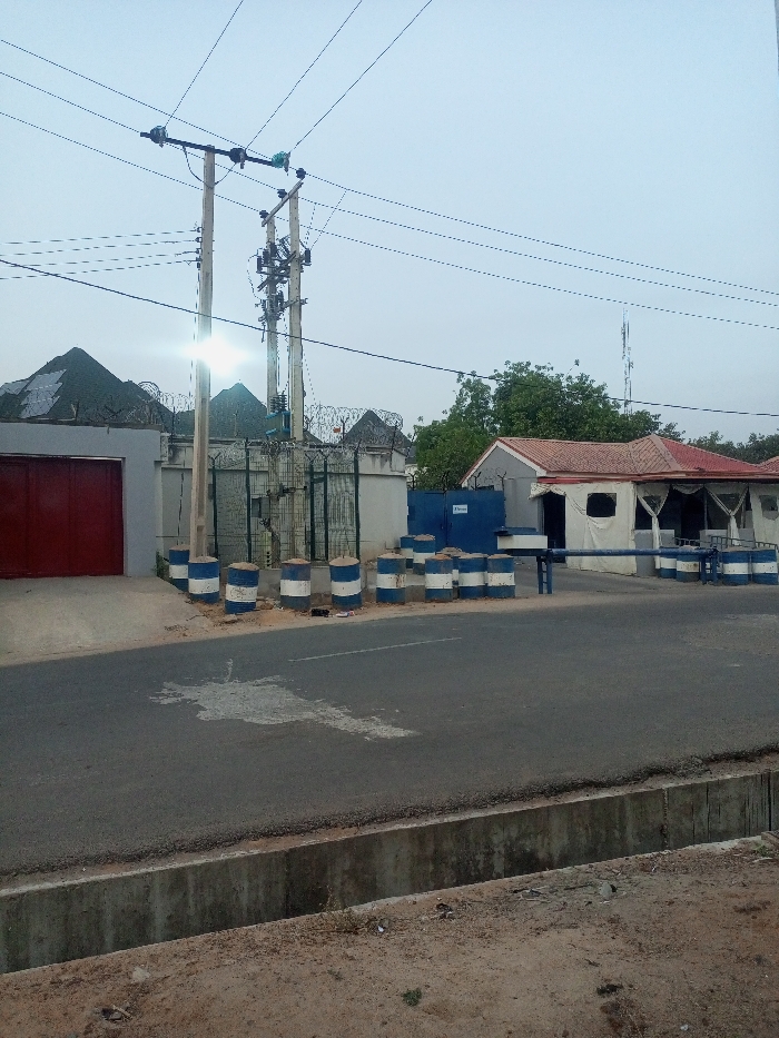 street scene in Maiduguri, Nigeria, at the coordinates 11.819 latitude and 13.157 longitude. The scene is shot from a low angle, looking toward a pair of tall power poles that stand near a concrete barrier and a building. The power poles are connected by several wires that cross the street and continue out of the frame. The barrier is composed of a line of blue and white striped barrels. To the left of the barrier is a gray concrete building with a red metal garage door. Behind the barrier is a building that looks like a residential home. The scene appears to be in a neighborhood, and the street is empty. It is a sunny day with no clouds in the sky.