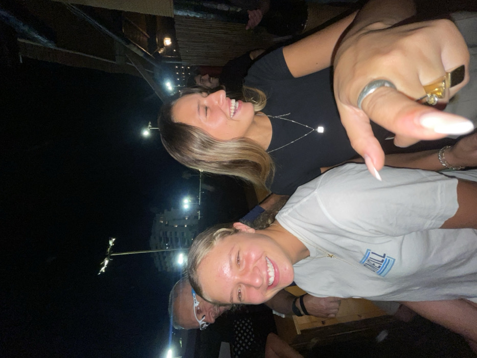 The scene depicts a nighttime outdoor gathering in the city of Unknown, Unknown, involving at least four individuals. In the foreground on the left, a woman with light brown hair tied back is smiling broadly at the camera, wearing a white t-shirt with a partial "O'NEILL" logo and a delicate gold necklace. To her right, a second woman with long, highlighted brown hair is laughing, looking towards the right with closed eyes, wearing a black t-shirt and a silver square pendant necklace. Her right hand is prominent in the immediate foreground, index finger extended directly towards the camera, displaying long, light-colored artificial nails and multiple rings: a silver band on the index finger and two gold-toned rings (one square signet, one with a dark square setting) on the middle and ring fingers. Behind the first woman, a man with graying hair and clear eyeglasses with blue accents is partially visible, looking to the left. Behind the second woman, another man with dark, wavy hair and a beard is partially visible, looking to the right. The background features a dark night sky illuminated by several tall streetlights. A multi-story, light-colored building is visible in the distance under the artificial light. To the far right, a vertical screen resembling bamboo or reeds suggests an outdoor establishment's boundary. A dark wooden surface, possibly a table or railing, is visible in the lower left.