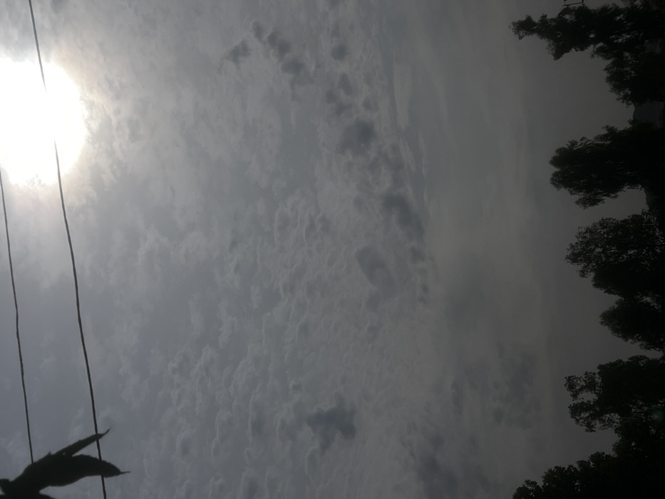 This image depicts an outdoor scene in Bukuru, Nigeria, primarily focusing on a cloudy sky and the silhouetted horizon. The upper two-thirds of the frame are dominated by a dense, grey, altocumulus cloud layer, with a prominent, bright, overexposed light source, consistent with the sun, visible in the upper right quadrant. Two dark, taut horizontal lines, consistent with utility wires or cables, traverse the upper portion of the sky. In the upper left quadrant, dark, back-lit foliage or leaves are visible, appearing to hang from or near the uppermost wire. The lower fifth of the image features a dark, silhouetted line of tree canopies, obscured by backlighting, forming the horizon against the cloudy sky. No human figures or discernible structures are present within the frame.