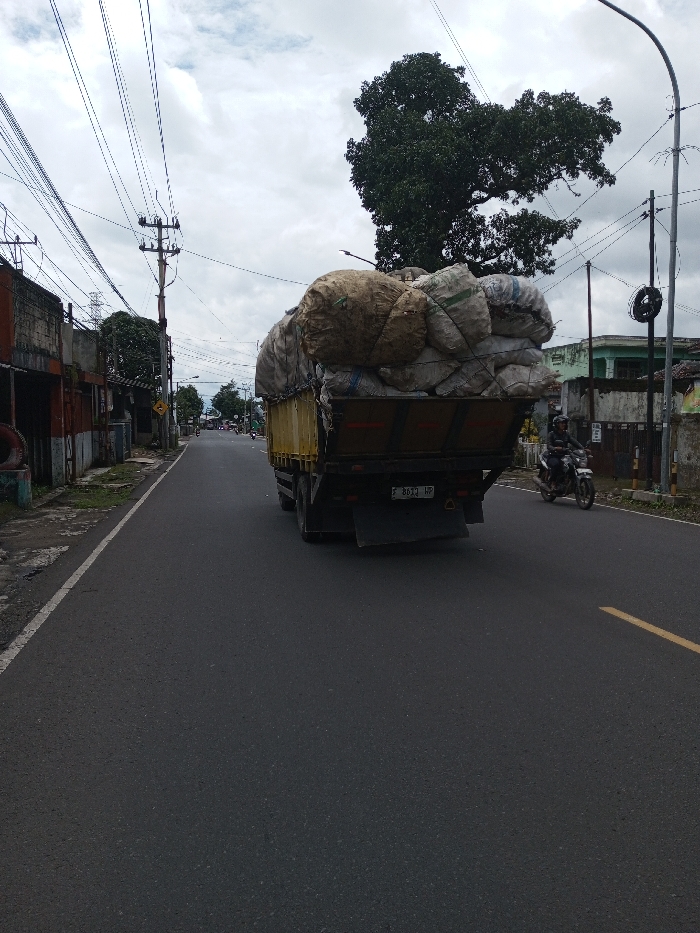 The image captures a street scene under an overcast sky. A yellow and black flatbed truck, heavily overloaded with a large, haphazard pile of light-colored sacks (appearing to contain bulky material), dominates the center of the frame, moving away from the viewer. The rear license plate of the truck displays "F 8633 HP," indicating vehicle registration in Indonesia, specifically West Java, not Serpang Shalli, Bhutan. To the right of the truck, a dark-colored motorcycle carries two individuals, both wearing dark helmets, also moving in the same direction on the paved asphalt road. The road features a continuous white line on its left edge and a partial dashed yellow line on the right, indicating separation of traffic lanes. On the left side of the street, a series of aged, two-story buildings with various states of disrepair and peeling paint line a narrow concrete sidewalk and dirt strip. Numerous black utility wires and cables crisscross overhead, supported by several wooden and metal utility poles. Further down the street on the left, a large tree with dense green foliage is visible. On the right side of the street, a low wall and a light-colored building are present. A tall, dark street light pole stands near the foreground, with another utility pole further back. A large tree with a broad, dark green canopy rises prominently behind these structures, silhouetted against the grey, cloudy sky. The overall environment suggests an older urban or semi-urban area with active vehicle traffic and extensive overhead utility infrastructure.