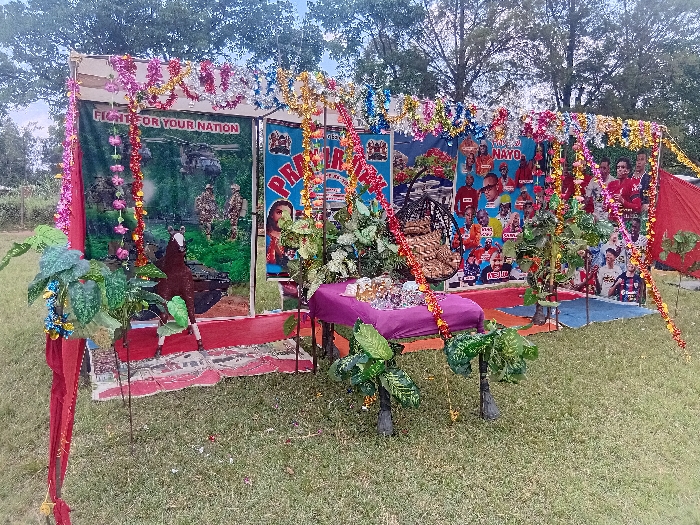 The image displays an outdoor event setup in Bunyala Central ward, Kenya. A multi-paneled backdrop, heavily decorated with colorful tinsel garlands, serves as the central focal point. The leftmost panel features a graphic depicting military personnel and tanks in a forested environment, with the text "FIGHT FOR YOUR NATION" at the top. A brown horse sculpture is positioned on a red mat in front of this panel. The central panel showcases a large blue banner with partially visible text "PRE" and "NAYO," surrounded by multiple portrait photographs of various male individuals, including what appears to be a religious figure. A brown woven hanging chair rests on a red mat before this section. The rightmost panel exhibits a collage of photographs depicting several male figures, some appearing to be athletes. A red tent is partially visible on the far right. In the foreground, a table draped in purple fabric holds an array of small, shiny objects, likely packaged items or trinkets. Artificial green plants, some on decorative stands resembling tree trunks, are strategically placed around the setup and integrated into the garlands. The entire scene is situated on a neatly maintained grassy field. Trees are visible in the background beneath an overcast sky. No individuals are present or actively interacting within the visible frame.