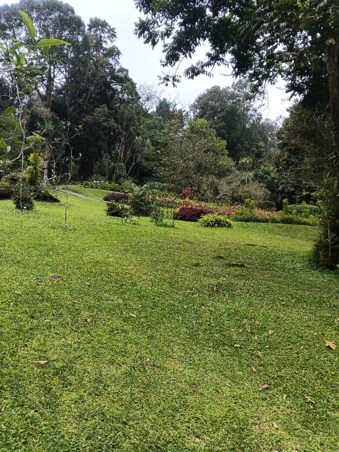The image displays an expansive, manicured green lawn occupying the foreground and mid-ground. Scattered brown leaves are present on the grass. In the mid-ground, a gently curving pathway, appearing to be dirt or gravel, ascends towards the left, bordered by meticulously maintained garden beds. These beds feature diverse foliage, including plants with prominent red, purple, and various shades of green leaves and flowers. Several metallic, cage-like structures, possibly plant supports or decorative elements, are visible within these beds. The background is dominated by a dense collection of tall, mature trees, forming a verdant backdrop under an overcast or bright sky. No individuals, animals, or active movements are observed. The environment suggests a cultivated park or botanical garden setting. The specific location within Kwekwe, Zimbabwe, is not visually identifiable from the provided image.