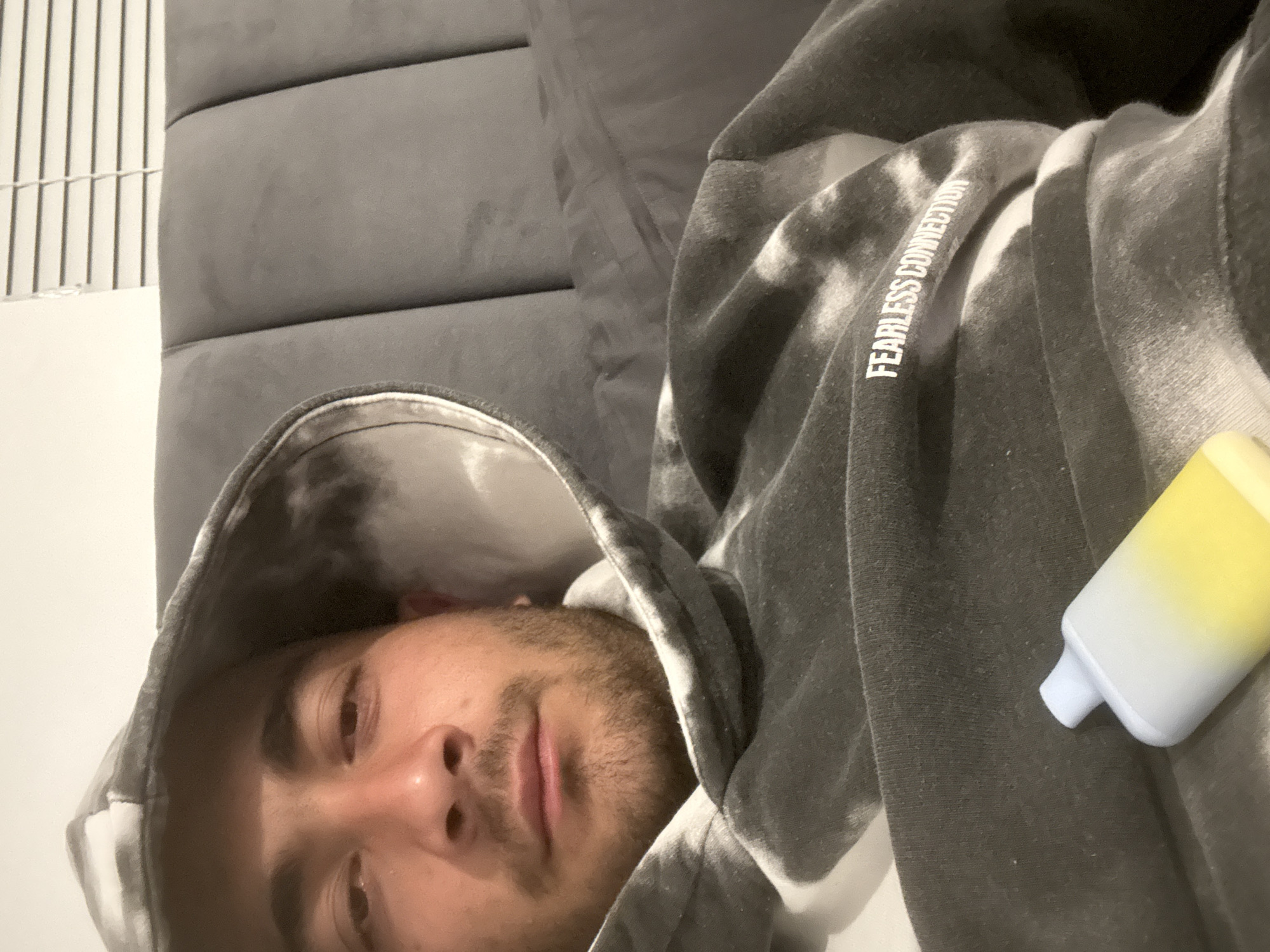 The image displays an indoor scene featuring an adult male positioned for a close-up, selfie-style photograph. No specific features within the image indicate a location in Listowel, Ireland; the setting appears to be a generic interior space, possibly a bedroom or living area. The male subject has short dark hair, a light mustache, and stubble. He is looking directly at the camera with a neutral expression. He wears a hooded sweatshirt featuring a grey, black, and white tie-dye pattern. White text, partially visible on the front of the sweatshirt, reads "FEARLESS CONNECTION." Resting on the front of the subject's hoodie is a small, cylindrical electronic device, likely a disposable vape pen, which is white at the top and transitions to yellow at the bottom. In the background, to the right of the subject, is a grey upholstered panel, possibly a headboard or wall feature, characterized by vertical seams. Above this panel, a section of a white wall is visible, along with horizontal white Venetian blinds, partially open, allowing light to enter the space. The lighting is soft and consistent with an indoor environment. There are no overt actions or interactions beyond the subject posing for the photograph.