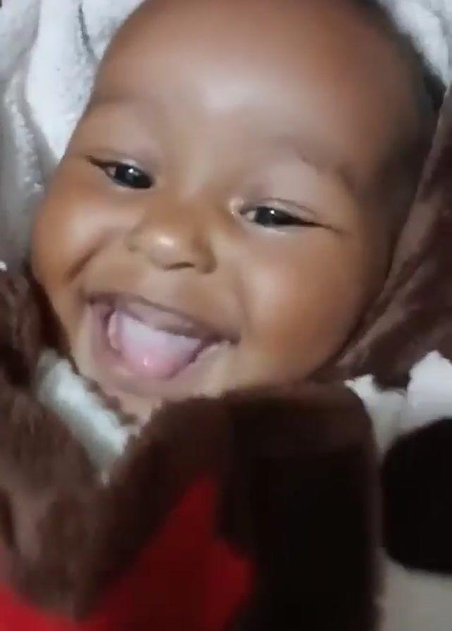 close-up of a smiling baby lying down, wrapped in a brown and white hooded blanket. The baby has dark skin, dark eyes, and is sticking its tongue out. The background is blurry. The focus is on the baby's face and expressions.