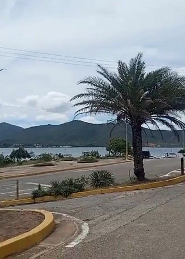 scenic view of a coastal area with mountains in the background and a body of water dotted with boats. A palm tree is prominently featured in the foreground, positioned alongside a road. The sky is overcast with clouds, suggesting a possibly temperate day. Power lines stretch across the sky, adding a touch of urban infrastructure to the natural setting. The road is paved and includes yellow curbing, with some greenery and small plants along the roadside. The camera captures the scene from a stationary position, offering a view of the natural landscape and the human-made infrastructure in coexistence. A human finger briefly enters the shot, obstructing the view.