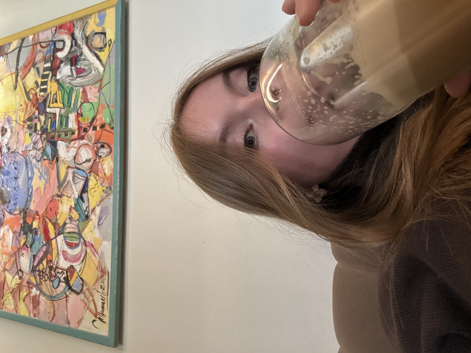 This image captures an indoor scene featuring a person drinking from a glass, with an abstract painting displayed on a wall in the background. The individual, a young female, is positioned in the lower center, looking directly at the camera with light-colored eyes. She has light brown hair and fair skin, and is wearing a dark, possibly brown, knitted garment. A small, light-colored, possibly floral earring is visible on her right earlobe. She holds a clear, cylindrical glass containing a light brown, foamy beverage, which is angled towards her mouth as if in the process of drinking. Above and behind the individual, a vibrantly colored abstract painting hangs on a plain, light-colored wall. The artwork is characterized by a dense arrangement of shapes, lines, and textures in a diverse palette of colors including yellow, orange, red, pink, blue, green, white, and black. A signature, "K.Hummel 2023" or similar, is discernible in the bottom left corner of the painting. The painting is framed, with a light teal colored bottom edge and a yellowish-gold colored right edge. To the individual's left, a dark brown upholstered surface, consistent with a sofa or booth, is partially visible. This scene takes place indoors. Although the image is set in the city of Sochi, Russia, a precise location or establishment within the city cannot be discerned from the visual information provided.