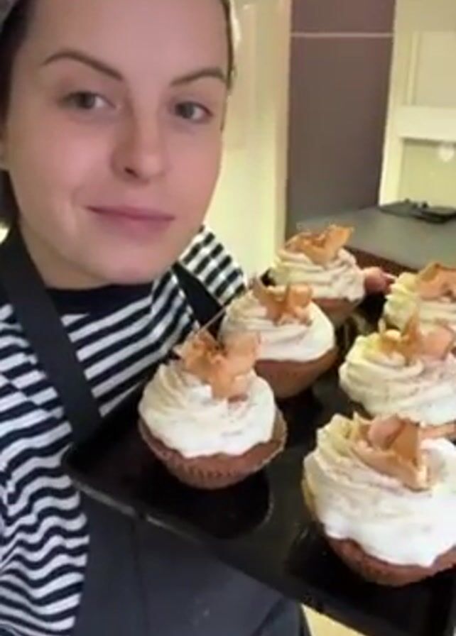 A woman in a hairnet, black apron, and striped shirt is holding a tray of cupcakes. The cupcakes have white frosting with a dusting of cinnamon, and they are decorated with dehydrated apple slices. The woman is looking at the camera with a slight smile, presenting the tray. The background shows a kitchen area with red cabinets and a gray countertop. The floor is a light-colored laminate.