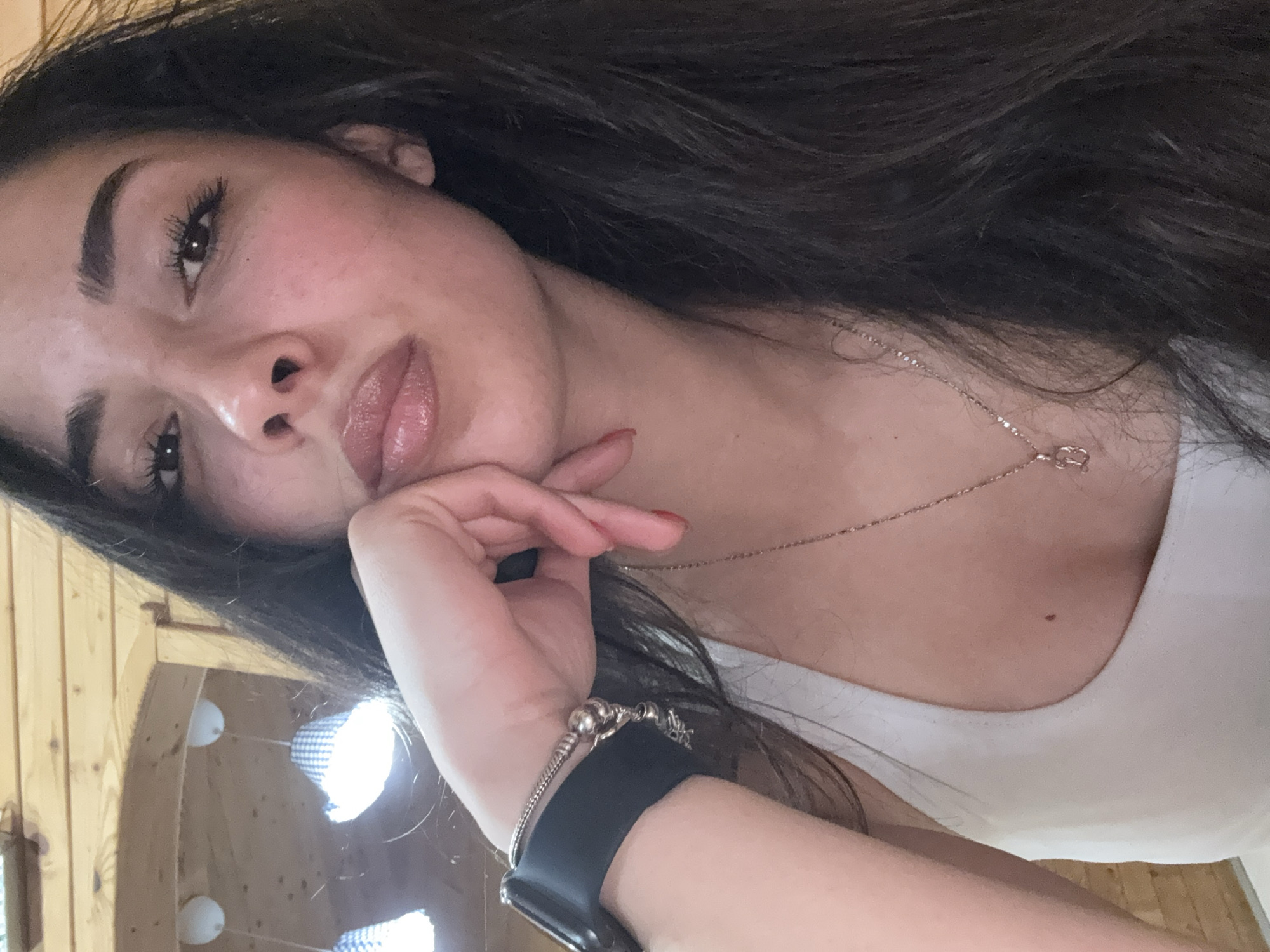 A woman with long, dark hair and brown eyes is pictured in a close-up, indoor selfie. She is wearing a white tank top and a silver chain necklace. A smart watch with a black band and a silver charm bracelet are visible on her left wrist. Her face rests on her left hand with red nail polish. In the blurred background, a wooden structure with round, illuminated light fixtures can be seen. Based on prior information, this scene is located in Malak Izvor, Bulgaria.