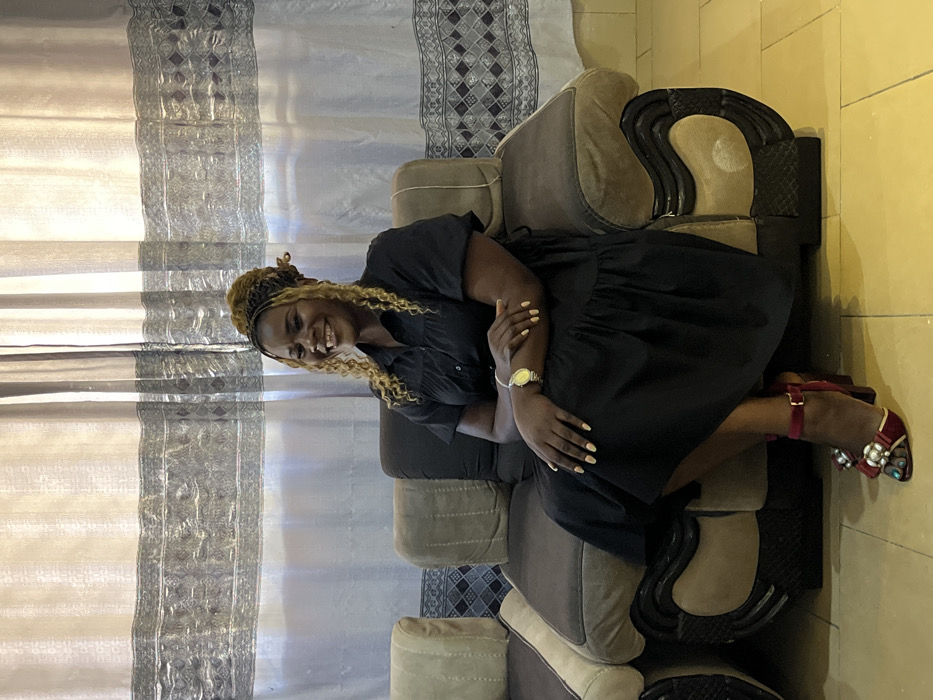 The image depicts an adult female seated on a sofa in an indoor setting, identified as the city of Rafin Bauna, Nigeria