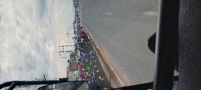 A busy roadside market thrives under a cloudy sky, vendors line the street with colorful umbrellas and goods. The view is taken from a vehicle, capturing the edge of the dashboard and seat. A paved road stretches ahead, contrasting with the lively, crowded market area. Electrical poles and wires run along the edge of the market, adding to the urban scene. The image captures the dynamic energy of roadside commerce.