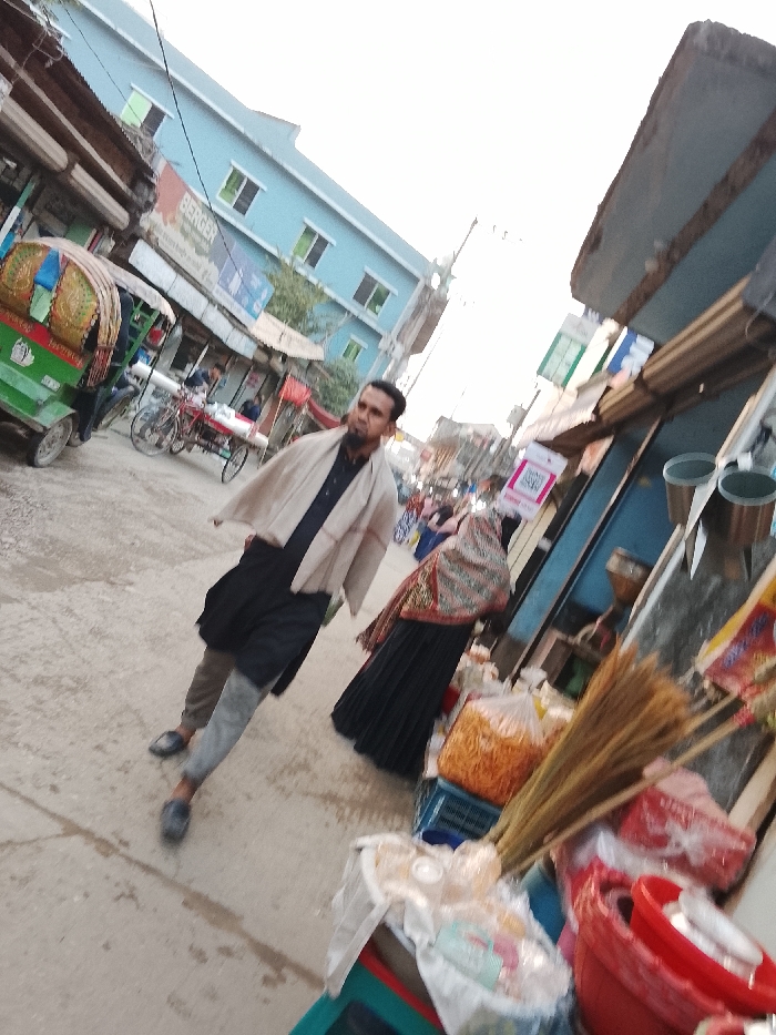 The image depicts a bustling street scene in Tarabo, Bangladesh. In the immediate foreground on the right, a street vendor's display features bundles of brooms, large clear bags of orange snack foods, red plastic buckets, and other packaged goods arranged on a stand and in crates. Centered in the mid-ground, a man with a dark beard and hair walks towards the viewer. He wears a black kurta, grey trousers, black shoes, and a light beige shawl draped over his shoulders, with his left arm partially concealed. Behind him and slightly to the right, a woman walks away from the viewer, attired in a dark pleated skirt or dress and a patterned, multi-colored shawl covering her head and shoulders. In the background on the left, a green auto-rickshaw with a decorative roof is visible. Further down the street, a man operates a bicycle rickshaw with a small flatbed cart. A prominent light blue multi-story building with multiple windows stands behind these vehicles. Below it, a "BERGER" sign is affixed to a shop front. On the right side, an awning above a shop displays a pink square QR code, characteristic of mobile payment services. The ground is a light-colored, unpaved or lightly paved surface, and overhead utility lines are visible against a bright, overcast sky.
