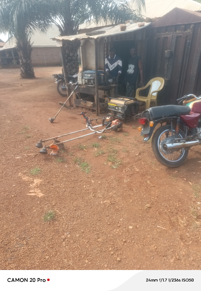 The image displays an outdoor scene in Makurdi, Nigeria, featuring a rudimentary open-fronted shop or stall constructed from corrugated metal and wood. Two adult males are visible within the structure. The male on the left wears a white and black long-sleeved shirt with a logo, standing near a workbench. The second male, partially obscured, wears a dark t-shirt. Inside the shop, multiple portable generators are present on the workbench and floor, along with a yellow plastic chair. The ground surrounding the structure is unpaved, consisting of reddish-brown laterite with sparse patches of green grass. On the ground in front of the shop, two gasoline-powered brush cutters or weed trimmers are laid out. A dark-colored motorcycle is partially visible parked to the left of the shop. On the right side of the foreground, the rear section of a red and black motorcycle is visible. In the background, to the left of the shop, several tall palm trees and distant buildings with light walls and brown roofs are present. The scene is illuminated by natural daylight.