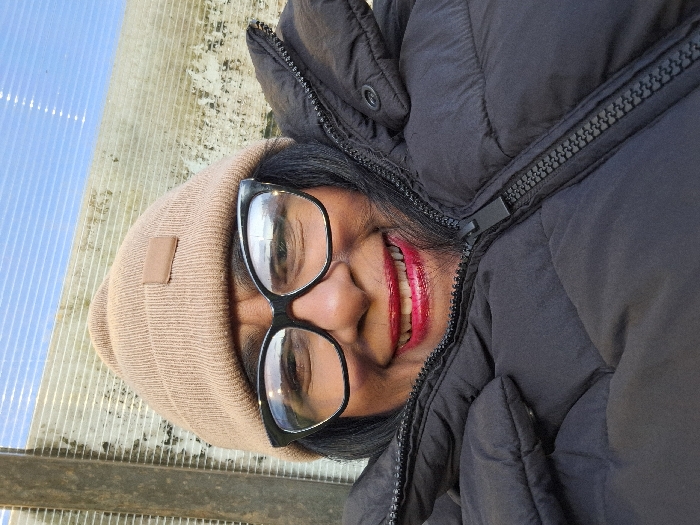 A person wearing a tan beanie and black-framed glasses is smiling broadly. She has on red lipstick. A dark puffer jacket is zipped up to her neck. The background includes a textured, translucent surface and a metal railing. The image is rotated, so the right side is facing upwards.