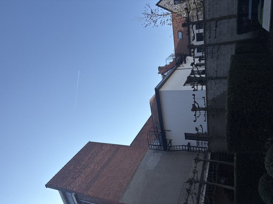The image displays an exterior view in Antwerp, Belgium, under a clear, bright blue sky featuring a single, faint white contrail from an aircraft in the upper right quadrant. On the left, a tall building presents a reddish-brown brick upper facade transitioning into a lighter, untextured grey section below. Its roof edge is dark. To its right, a smaller, white-rendered building with a dark-tiled, pitched roof and black trim is visible. A black metal exterior staircase, incorporating a landing and guardrails, ascends to a flat platform on this white building's roof. Dark-paned windows are present on the white structure. Further to the right and behind, additional buildings with reddish-orange tiled roofs, some featuring dormer windows, are observed. One building on the far right has a white facade and a steeply pitched dark roof. In the midground, a low grey cinder block wall runs horizontally. Several pollarded trees with exposed, gnarled branches and no foliage are spaced evenly along this wall. The immediate foreground is occupied by a dark green, dense hedge. To the right of the hedge, a small patch of ground and a metallic grate-like object are partially visible. No people or active interactions are depicted. The scene is illuminated by direct sunlight.