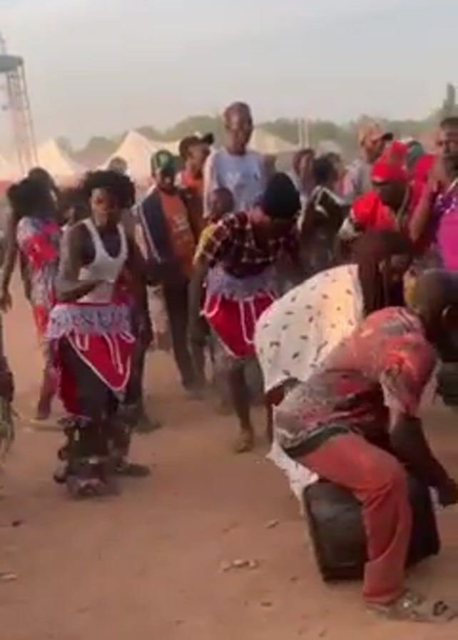 group of people dancing in an open dirt area. The dancers wear similar outfits: light colored tank tops and patterned red and white skirts, with adornments around their ankles. Some also carry what appears to be short sticks. They move in a synchronized style. Behind them is a crowd of onlookers, and in the background, there is a simple stage structure and several white tents. The sky is hazy, suggesting either early morning or late afternoon.