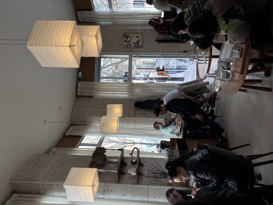 The image displays the interior of a bustling cafe or restaurant located on Rue de Babylone in Paris, France. The space features industrial-style exposed concrete walls, a white ceiling, and large windows flanked by light-colored drapes, revealing a street scene with bare trees. Overhead, multiple white, square-shaped paper lantern pendant lights illuminate the area. Approximately twelve individuals are visible within the establishment. In the left foreground, a woman wearing a black leather jacket is seated at a wooden table, engaged in writing or drawing. Further back on the left, three men are seated at a rectangular wooden table; two men, one in a light green shirt and another in a dark jacket, are conversing and smiling, while the third man is partially obscured. In the mid-ground right, several patrons occupy round wooden tables. One person in a dark patterned sweater is focused on a mobile phone, and another in a beige sweater with a green scarf is reading a book or magazine. Tables throughout the cafe hold water bottles, glasses, cups, and a small plant. An open glass door in the center background provides a view of the street outside and a person with light brown hair, dressed in a brown jacket and blue jeans, standing in the doorway, facing partially into the cafe. An emergency exit sign is mounted above the doorway, and a dark coat hangs on a hook nearby. The floor is a light, uniform color.