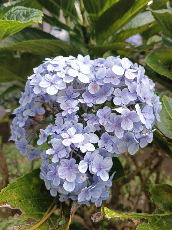 A cluster of blue and white hydrangeas blooms amidst vibrant green foliage