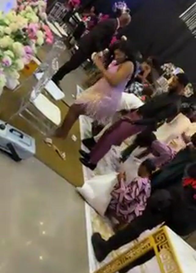 Several people are walking on top of large white bags, which are arranged on the floor of what appears to be a reception hall. The woman in the center wears a short lavender dress and holds a microphone. A man in purple pants walks beside her. One person in a floral shirt is sitting on the bags. The room is decorated with flowers and has a sound system. Another man in a black suit is seen in the background.