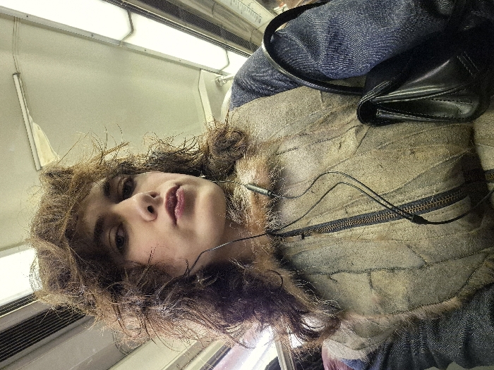 - "A young adult with long, disheveled, curly brown hair and light eyes is depicted in a close-up, low-angle shot within a public transport vehicle" by FM-O7Vkg2, licensed under CC BY 4.0